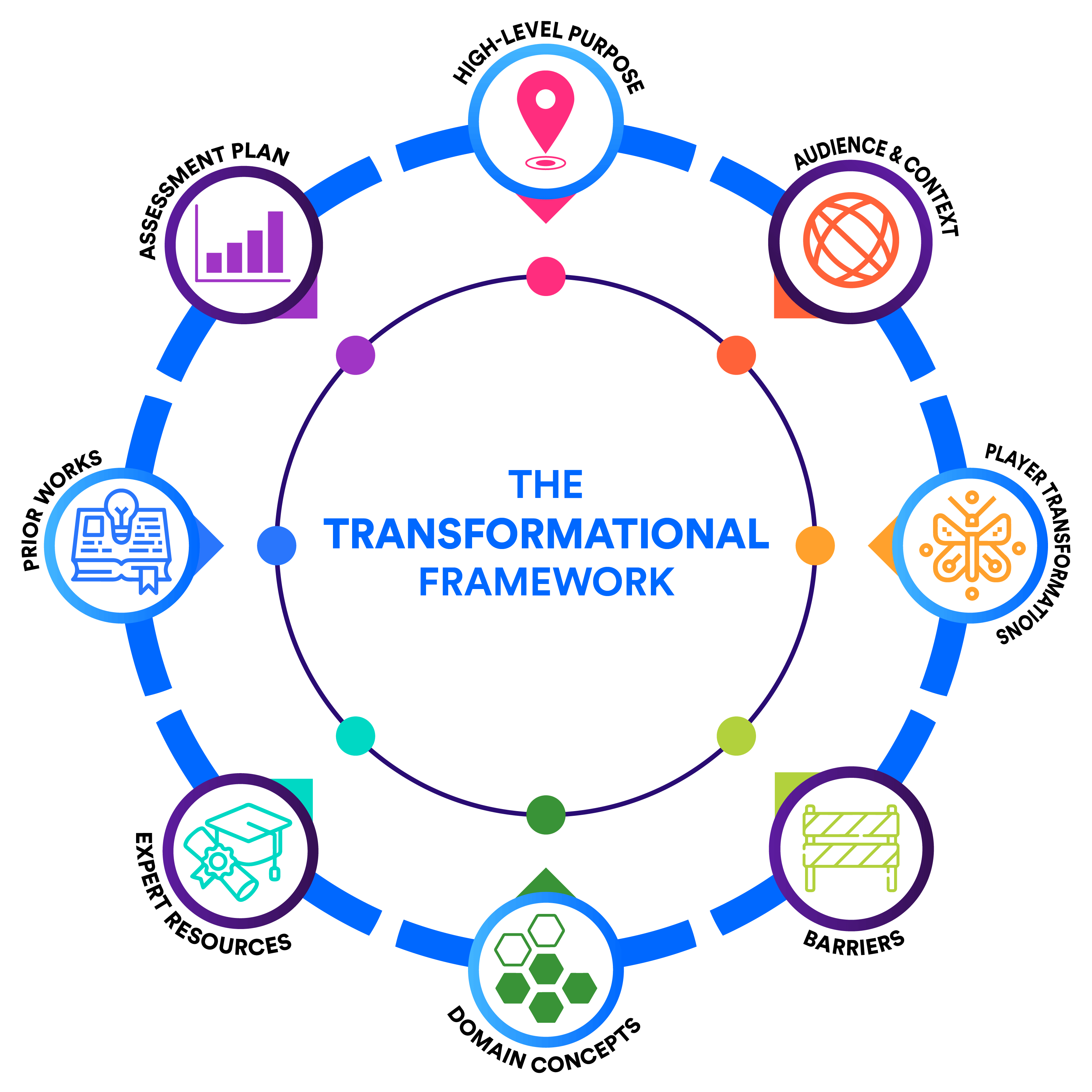 The Transformational Framework, initially coined by Sabrina Culyba, is valuable for developing eco-games that drive real-world change. By identifying components that are key to the success of a game that aims to transform the world around us, this framework helps create games that do more than just entertain. It emphasises practical pre-production processes built around exploratory questions covering eight critical topics and strategies for working with stakeholders and experts.